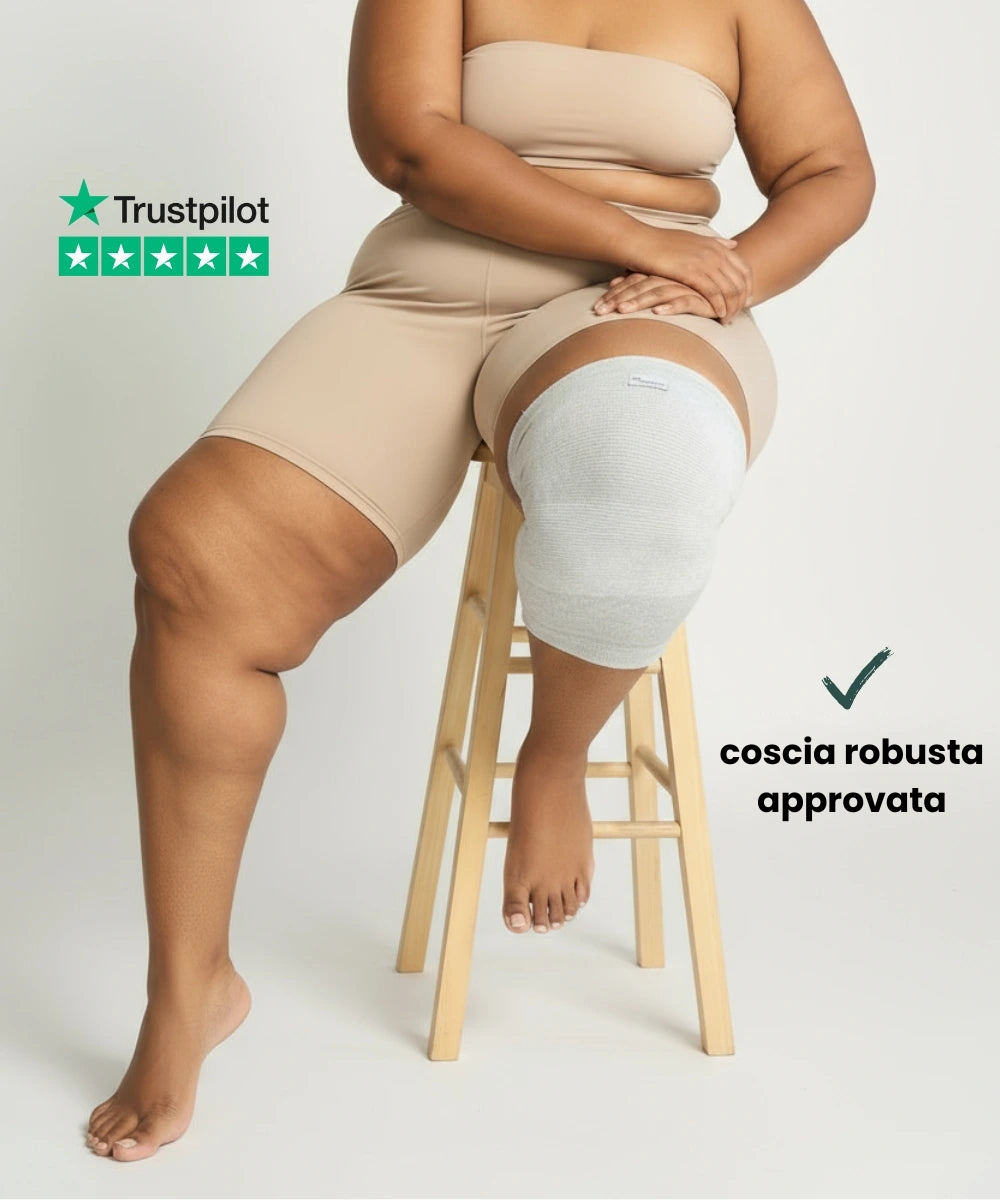 La maggior parte delle ginocchiere si ferma alle taglie “XL” fasulle e utilizza materiali che provocano prurito, si arrotolano e bloccano la circolazione.